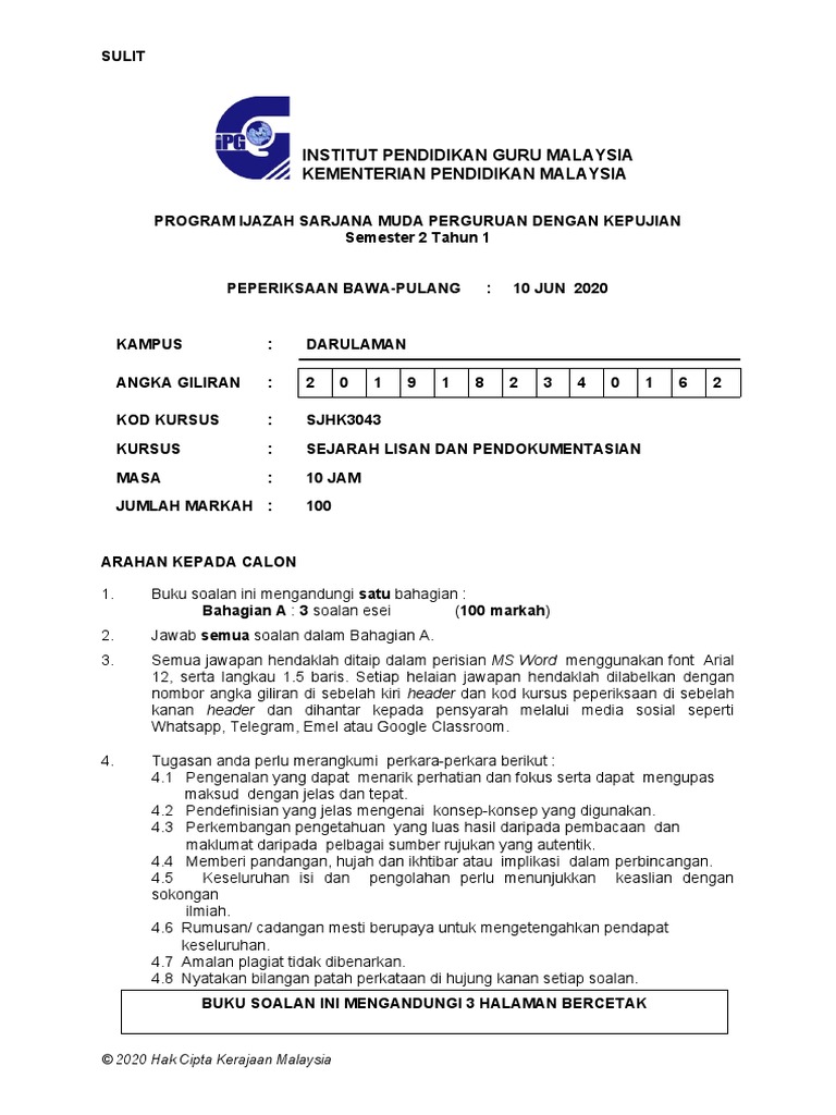 . Muat turun halaman 1-50 di AnyFlip. Bagi yang pertama kali nak jawab soalan psikometrik Kurator S41 pasti belum tahu macam mana bentuk soalan yang akan diberi. Obt Sjhk3043 Soalan Pdf Sulit Institut Pendidikan Guru Malaysia Kementerian Pendidikan Malaysia Program Ijazah Sarjana Muda Perguruan Dengan Course Hero Sjhk3043 Sejarah Lisan Dan Pendokumentasian Pdf Rangka Penulisan Sjhk 3043 Pdf Share.
